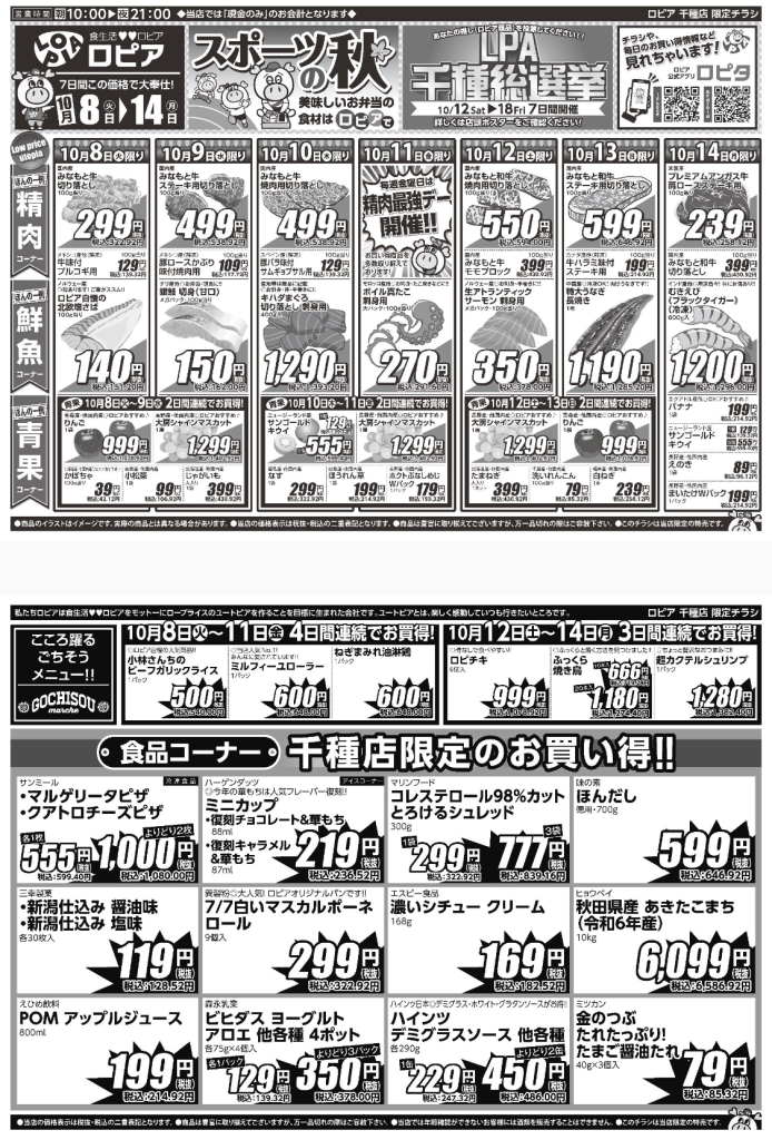 ロピア 千種店の『最新のチラシ』2024年10月8日(火)~10月14日(月)を紹介いたします。