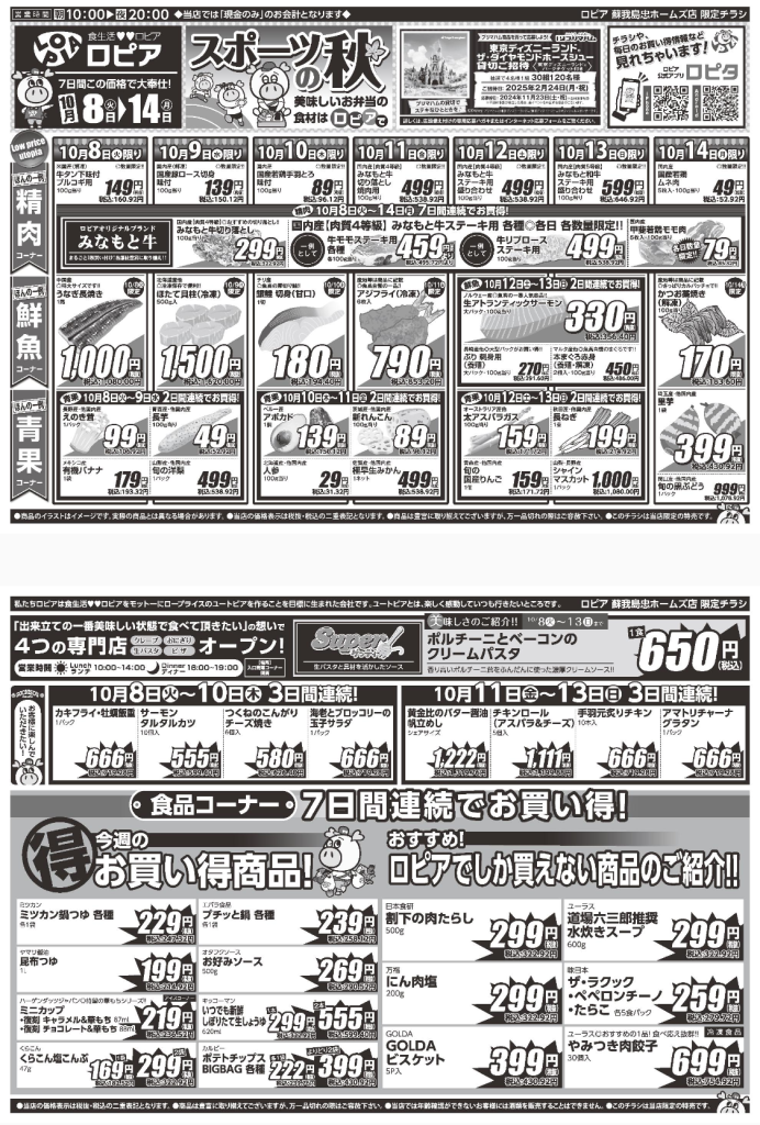 ロピア 蘇我島忠ホームズ店の『最新のチラシ』2024年10月8日(火)~10月14日(月)を紹介いたします。